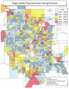 The map represents population by voting precinct for Nevada’s Las Vegas valley.